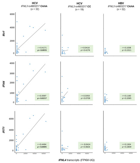 Similar to hepatic ISG expression, which is known to be stimulated in HCV-infections in nontumorous conditions, hepatic ISG expression was found to be activated in malignant tissue—specifically in patients with HCV infections as a risk factor—as well (p = 0.0027, p = 0.0001, and p = 0.0148 for Mx1, IFI44, and IFIT1, respectively, Kruskal–Wallis test, Supplementary Materials Figure S1). By combining all available data from the nonmalignant and malignant samples, a positive correlation for ISG mRNA expression and the number of functional IFNL4 transcripts could be found in the group of patients with HCV infection as a risk factor only (Figure 3). Of note, such a relationship was not found for the number of nonfunctional IFNL4 transcripts.