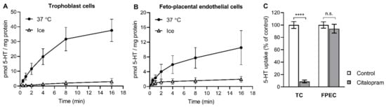 (A,B) Time- and temperature-dependent uptake of 5-HT into primary placental cells. Human primary (A) trophoblasts and (B) feto-placental endothelial cells were incubated in the presence of radiolabeled 5-HT (10−7 M) at 37 °C or on ice for 0.5 to 16 min. Values are the means ± SEM from two donors, each analyzed in triplicate. (C) The effect of citalopram on the uptake of 5-HT into primary placental cells. Trophoblast cells (TC) and feto-placental endothelial cells (FPEC) were incubated for 10 min in the presence of radiolabeled 5-HT (10−7 M) and citalopram (10−7 M) or vehicle (control). The specific uptake was calculated as the difference between transport at 37 °C and on ice and expressed as a percentage of the control. Values are the means ± SEM of two independent experiments, each performed in two or three replicates. **** p < 0.0001 compared to vehicle, n.s. not significant (Sidak’s multiple comparisons test following two-way ANOVA).