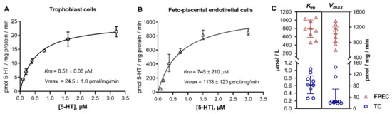 Kinetic analysis of the uptake of 5-HT into human primary placental cells. Human primary (A) trophoblasts and (B) feto-placental endothelial cells were incubated in the presence of six increasing 3H-5-HT concentrations between (A) 0.1 and 3.2 μM and (B) 94 and 3000 μM for 2 and 8 min, respectively. The specific uptake was calculated as the difference between transport at 37 °C and on ice. The initial rates of specific uptake were plotted against substrate concentration and fitted to the Michaelis–Menten kinetics model. Data (mean ± SD, n = 3) from one of the nine subjects studied are shown. (C) Best-fit values of the Michaelis affinity constant (Km) and maximal transport velocity (Vmax) obtained in trophoblast cells (TC) and feto-placental endothelial cells (FPEC) isolated from different placentas (n = 9 for each cell type). Lines represent the medians and interquartile range (for numerical results, see Table S1). Values of Km and Vmax were significantly different between trophoblasts and feto-placental endothelial cells (p < 0.0001 in both cases; t-test or Mann–Whitney test, as appropriate).