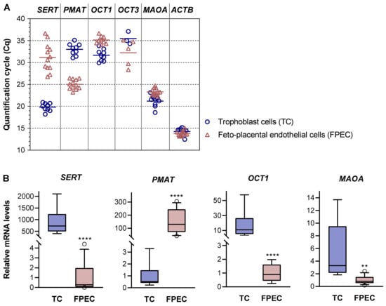 Expression of 5-HT regulating genes in primary placental cells. (A) Quantification cycle (Cq) values obtained by RT-qPCR analysis of serotonin transporter (SERT), plasma membrane monoamine transporter (PMAT), organic cation 1 (OCT1), organic cation 3 (OCT3), monoamine oxidase A (MAOA), and actin beta (ACTB) mRNAs in human primary trophoblasts (n = 9) and feto-placental endothelial cells (n = 12). A specific OCT1 signal was detected in 9 of the 12 feto-placental endothelial cell samples analyzed. A specific OCT2 signal was absent in all trophoblast and feto-placental endothelial cell isolations. A specific OCT3 signal was detected in 3 of 9 trophoblast and 5 of 12 feto-placental endothelial cell samples. For numerical results, see Table S2. (B) Relative expression levels of SERT, PMAT, OCT1, and MAOA mRNAs normalized to ACTB mRNA. For each gene, the mean of the cells with the lower expression level was arbitrarily set to 1.00. Data are presented as boxplots with whiskers indicating the 10th and 90th percentiles and circles showing individual values outside the whisker range (n = 9 for TC; n = 12 for FPEC, except for OCT1 where n = 9). ** p < 0.01, **** p < 0.0001 (t-test or Mann–Whitney test, as appropriate).