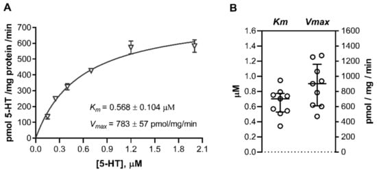 In the initial uptake rate studies, the uptake of 5-HT was measured within an experimentally determined linear time range, at six increasing 5-HT concentrations covering a range typical of a high-affinity (0.1, 0.2, 0.4, 0.8, 1.6, and 3.2 μM) or low-affinity (94, 188, 375, 750, 1500, and 3000 μM) uptake mechanisms. The initial rates of specific 5-HT uptake were fitted to the Michaelis–Menten kinetics model using GraphPad Prism software version 8 (GraphPad Software, LLC, San Diego, CA, USA). Best-fit values of the Michaelis affinity constant (Km) and maximal transport velocity (Vmax) were estimated by nonlinear least-squares regression analysis.