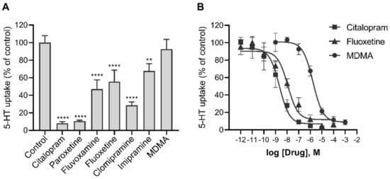 The potency of various psychotropic drugs to inhibit the uptake of 5-HT into human primary trophoblasts. Cells were incubated for 10 min in the presence of radiolabeled 5-HT (10−7 M) and (A) 10−7 M or (B) increasing the concentrations of the indicated drugs. Values are expressed as a percentage of control (vehicle without the drug). The best-fit half-maximal inhibitory concentrations (IC50) of citalopram, fluoxetine, and MDMA were 2, 11, and 1678 nM, respectively, with 95% confidence intervals (CI) of 1 to 7 nM, 4 to 33 nM and 1045 to 2745 nM, respectively. All data are the means ± SEM of three separate experiments, each performed in triplicate. Cells from different donors were used to generate the data shown in panels A and B; the values for fluoxetine in panel A (44%) are not statistically different from the values for 10−7 M fluoxetine in panel B (29%). ** p < 0.01, **** p < 0.0001 for comparison with control (Dunnett’s test after one-way ANOVA, F7,16 = 52.34, p < 0.0001). MDMA—3,4-methylenedioxy-methamphetamine.