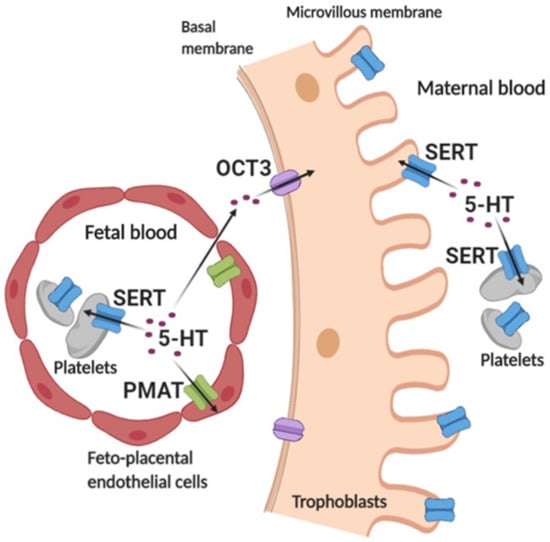 The placenta is a complex, heterocellular organ interposed between the maternal and fetal blood. Among others, two main cell types that form the maternal–fetal blood barrier are trophoblasts covering the surface of the villous trees and facing the maternal blood, and feto-placental endothelial cells, which form the feto-placental vessels and are in direct contact with the fetal blood. There is evidence for the placental uptake of 5-HT from both maternal and fetal circulation at the end of human pregnancy.
