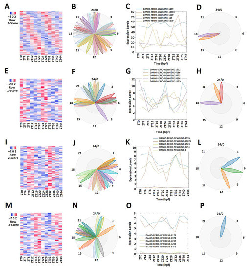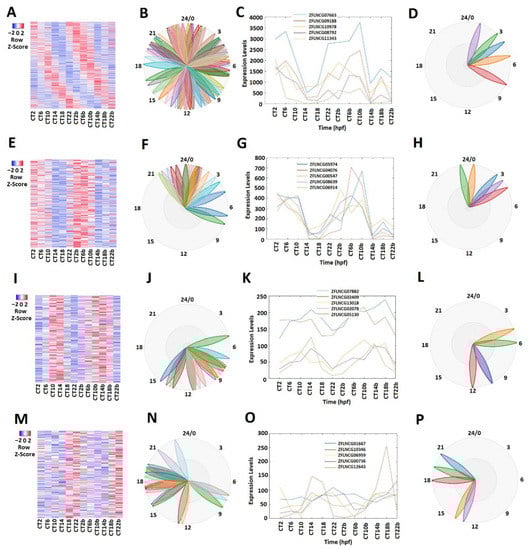 Different circadian clock genes or circadian-clock-controlled genes are expressed in a time-of-day-specific manner, and peak at the specific time of day [32,33,34]. We hypothesized that the rhythmically expressed lncRNAs also display time-of-day-specific expression patterns, as with the circadian clock genes or circadian-clock-controlled genes. In order to find such rhythmic expression patterns, we first investigated the rhythmicity of pineal gland lncRNAs using MetaCycle (Supplementary Table S3). Out of 10,013 lncRNAs, 586 were determined to be rhythmic, with a p-value significance level of less than 0.05 (Figure 1A–D; Supplementary Table S5). The phase values of these 586 lncRNAs were calculated and displayed using BioDare2. The heat map (Figure 1A) clearly demonstrated phase correlation among these 586 rhythmic lncRNAs. Next, these rhythmically expressed lncRNAs were further analyzed via principal component analysis (PCA) (Supplementary Figure S2A–D), and the top-ranked rhythmically expressed lncRNAs of the pineal gland (Supplementary Table S6) were selected and their representative phases were plotted as shown in Figure 1B,F,J,N. Furthermore, based on the expression patterns, these rhythmically expressed pineal gland lncRNAs were classified into morning (CT 2 and CT 6), evening (CT 10 and CT 14), and night (CT 18 and CT 22) lncRNAs. Overall, we found 241 morning lncRNAs (E–H), 196 evening lncRNAs (I–L), and 149 night lncRNAs in the zebrafish pineal gland (Supplementary Table S5). The phase (Figure 1C,G,K,O) and period (Figure 1D,H,L,P) diagrams clearly demonstrated the expression patterns for morning lncRNAs, evening lncRNAs, and night lncRNAs, as shown by BioDare2.