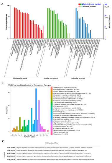 GO analysis is a major bioinformatics initiative to unify the representation of gene and gene product attributes across all species [54]. To investigate and understand the functional enrichment of the rhythmically expressed zebrafish pineal gland and testis lncRNAs, we performed Gene Ontology (GO) [55] analysis of all rhythmically expressed lncRNAs. The functional information of lncRNAs was represented via GO annotation—a controlled vocabulary of functional attributes. We exploited the BLAST [56] algorithm integrated with Blast2GO [57], a bioinformatics software suit for automatic, high-throughput functional annotation of novel lncRNA sequences. Blast2GO makes use of the BLAST algorithm to identify similar sequences, and then it transfers existing functional annotation from the characterized sequences to the novel one. For all of these zebrafish lncRNAs, neither the gene names nor transcript IDs were available. Therefore, in order to predict the gene names, functions, etc. for the given sequences, we applied the BLAST algorithm to BLAST all of the zebrafish sequences against the NCBI’s nucleotide collection (nt) database, in order to obtain the desirable ortholog sequences. In order to understand the functional annotations of the lncRNAs, we investigated their orthologs. Furthermore, for all of the lncRNAs mapped to Ensembl gene IDs, we applied BMKCloud available online: https://international.biocloud.net/ (accessed on 15 May 2021) tools for Clusters of Orthologous Groups (COG) [36] analysis and visualization of GO analysis. The BMKCloud GO analysis revealed their roles in different biological processes, cellular components, and molecular functions. COG analysis was applied for functional classifications (such as RNA processing and modification, chromatin structure and dynamics, cell cycle control, and mitosis) of the genes from newly sequenced genomes.