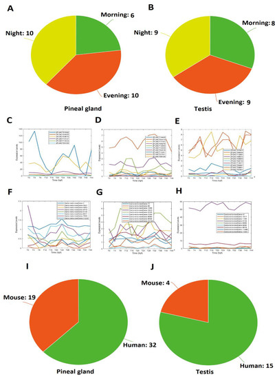 Intriguingly, lncRNAs also contribute to circadian regulation [17,18]. For example, a recent study [17] found the role of lncRNAs in perturbing the circadian rhythms of hepatoma cells. Another study [19] found differential expression of over 100 lncRNAs in the rat pineal gland—the tissue directly responsible for synthesizing the hormone melatonin [20]. However, very little is known about lncRNA-mediated clock regulation. The testis is an important organ involved in several biological functions, such as producing gametes and circulating androgens [21]. The germ cells divide and differentiate within the testicular seminiferous tubules. However, the presence of a circadian clock in the testis is still debatable. For example, a previous study [22] reported a lack of circadian rhythms in testis, whereas another [23] suggested circadian clock gene expression in the testes of multiple species. Hence, investigating rhythmically expressed genes in the testis can shed light on the operating mechanisms of the circadian clocks in the testis.