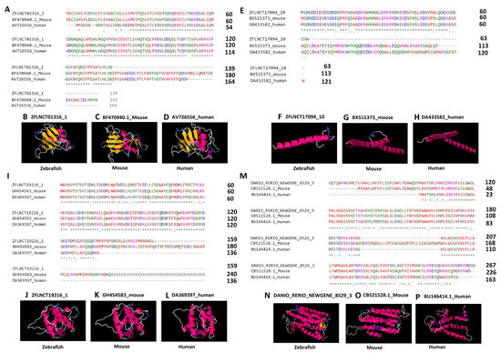 Multiple sequence alignment and three-dimensional structures predicted by (PS)2-v2: protein structure prediction server for the highly conserved lncRNA-encoded peptides among zebrafish, humans, and mice. Pineal gland lncRNA-encoded peptides (A–L) and testis lncRNA-encoded peptides (M–P). The asterisk symbols (A,E,I,M) depict the identical amino acids among the peptides encoded by zebrafish lncRNAs (ZFLNCT01316_1, ZFLNCT17094_10, ZFLNCT19216_1, and DANIO_RERIO_NEWGENE_8529_1), as well as their corresponding mouse orthologs (BF470940.1_Mouse, BX515373_mouse, GH454583_mouse, and CB521528.1_Mouse) and human orthologs (AV726556_human, DA433582_human, DA369397_human, and BU146414.1_Human). The 3D models of the peptides (B–D,F–H,J–L,N–P) represent the conservation of α-helix (pink or purple motif structure), β-strand (yellow layered band), and random coils (white or blue thread) among zebrafish, humans, and mice with known domains from the Protein Data Bank, such as, B (2adcA), C (2adcA), D (2adcA), F (1nkpB), G (1nkpB), H (1nkpB), J (1wyoA), K (1wyoA), L (1wyoA), N (1u19A), O (2vt4B), and P (1xioA).