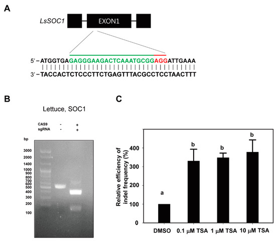 We tested whether a compound for epigenetic regulation, TSA, plays a stimulatory role in CRISPR/Cas9 genome editing during PEG transfection, especially by leading to chromatin structural modification. To prove this hypothesis, first of all, we selected the lettuce SOC1 gene and tobacco PDS gene as targets for genome editing from protoplasts. We designed the gRNA of the lettuce SOC1 gene using CRISPR RGEN Tools (http://www.rgenome.net/cas-designer/) (Figure 1A) and the gRNA of the tobacco PDS gene by referring to the previous study for gRNA design (Figure S1A). To investigate whether gRNA works properly, we examined whether it was cleaved under in vitro conditions. It was confirmed that Cas9–RNP complexes from lettuce were cleaved well at their target sites in the in vitro cleavage assay (Figure 1B).