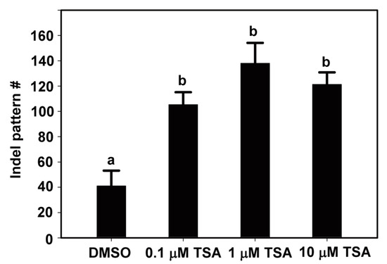 The number of indel patterns at the LsSOC1 target loci in protoplasts examined at 48 h after transfection of Cas9 protein and gRNAs as RNP complexes with DMSO or TSA treatment. The total number of various indel patterns according to TSA treatment was analyzed by targeted deep sequencing.