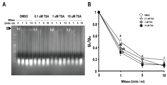 Since the packaging of eukaryotic DNA into chromatin restricts the ability of the Cas9 protein and gRNA to access their target and the recruitment of DNA damage repair machinery to DNA DSB sites cleaved by Cas9, the potential relationships between chromatin remodeling and genome editing have been explored in many organisms, from yeast to humans [21,22,23,24]. Accordingly, we investigated the effects of TSA on chromatin structure by a chromatin accessibility test using micrococcal nuclease (MNase) that cuts internucleosomal DNA. The ratios of intact genomic band intensities treated with different concentrations of MNase (gc) to the non-treated control (g0) represent the degree of chromatin relaxation. It can be seen that the higher the concentration of MNase in the DMSO-treated group, the lower the ratio of gc/g0 (Figure 4). Chromatin accessibility of TSA treatment groups was higher than that of DMSO treatment group, as revealed by the lower g0/gc ratio. When treated with 1 units/mL MNase, the ratio decreased significantly according to the TSA concentration, which means that chromatin accessibility was higher. Although the difference between the TSA and DMSO treatment groups was small when 5 and 10 Units/mL MNase were treated, the ratio of gc/g0 of the TSA-treated group was lower than that of the DMSO-treated group, which means that chromatin accessibility was higher. These results indicate that TSA has a positive effect on the chromatin structural modification in protoplasts and may influence the ability of gRNA to access the target or the recruitment of DNA damage repair machinery to DNA DSB cleaved by Cas9 after PEG transfection.