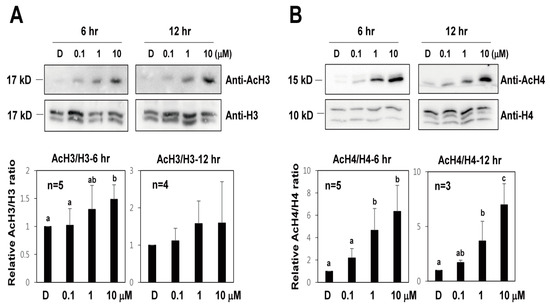 It was reported that TSA causes an increase in global histone H3 and H4 acetylation in plants [14,17,25,26]. To investigate the effect of TSA on histone acetylation in protoplast conditions, Western blot analysis with H3 and H4 acetylation antibodies and H3 and H4 antibodies was carried out in lettuce protoplasts after TSA treatments (Figure 5). After 6 and 12 h of TSA treatments, histone H3 and H4 acetylation in lettuce protoplasts was significantly increased compared to that in the control, and this increase was concentration-dependent. These results indicate that the level of histone H3 and H4 acetylation was increased by TSA from lettuce protoplasts.