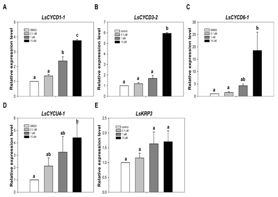 We have already demonstrated that TSA has a stimulatory role in increasing the efficiency of genome editing from protoplasts. Initial cell division and callus formation from protoplast are essential steps for the development of genome-edited plants using the CRISPR/Cas9 RNP system. In order for TSA to be used as a positive stimulator for the development of genome-edited plants, its effect on subsequent cell division and callus formation from protoplasts must be investigated. If TSA prevents subsequent cell division and callus formation from protoplasts, it cannot be used as a positive stimulator for the development of genome-edited plants. Thus, we first checked how TSA treatment affects cell division-related gene expression from lettuce protoplasts. The quantitative reverse transcription PCR (qRT-PCR) analysis showed that the transcripts levels of LsCYCD1-1, LsCYCD3-2, LsCYCD6-1, and LsCYCU4-1 were increased by TSA treatment, except for LsKRP3 (Figure 6). Overall, when a high concentration of TSA (10 µM) was treated, cell division-related gene expression was also significantly increased. Compared to the high-concentration TSA treatment, the gene expression was decreased in the low-concentration (0.1 μM) TSA treatment. These results show that the TSA-induced increase in gene expression occurs in a concentration-dependent manner. On the other hand, there was no statistically significant difference in the expression of the cell division inhibitor KRP3 gene by TSA treatment. Considering these results, we suggest that TSA treatment has a positive effect on the expression of cell division-related genes as well as genome editing efficiency from lettuce protoplasts.