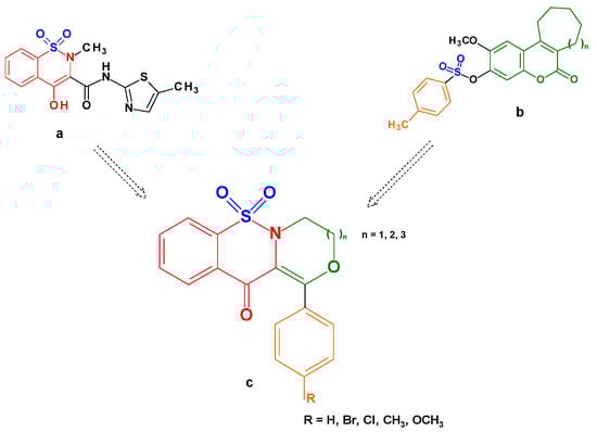 Our new derivatives, similarly to the El-Gamal’s compounds, have three conjugated rings and a sulfonyl group. To the 1,2-benzothiazine skeleton in which the sulfonyl group is a part of the thiazine ring, we had added a third oxazine, oxazepine or oxazocin ring (Figure 3). The most active of El-Gamal’s compounds had also a methyl and methoxy substituent; therefore, it was planned to incorporate these substituents as well into the new structures. Besides, compounds with bromine or chlorine substituents were planned to be explored for the effects of these structural modifications on the COX-2 inhibitory activity.