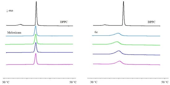 The example thermograms obtained for DPPC mixed with meloxicam (left) and compound 6e (right) as well as for pure lipid (the first curve from the top—black color). Curves in the Figure represent the thermograms obtained for different molar ratios (studied compound: DPPC—from the bottom: 0.12, 0.10, 0.08, 0.06, pure lipid). The exothermic direction in this graph is downward.