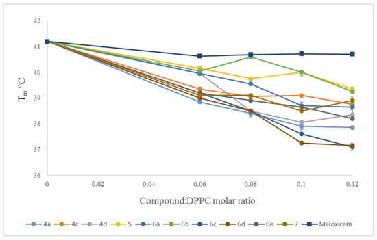 The dependencies of the DPPC phase main transition temperature (Tm) on the 1,2-thiazine derivatives: phospholipid molar ratio obtained for mixtures of DPPC with the studied compounds and meloxicam are shown in Figure 5. In DSC studies, meloxicam appeared to be the least effective compound.