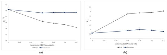 The dependencies of the DPPC phase main transition temperature (Tm) and the peak transition half-height (∆T½) on DPPC mixed with 6e compound or meloxicam are shown in Figure 4 and Figure 6. Whereas, regarding the dependencies of the transition peak half-height width (∆T½) and transition enthalpy (∆H) of the main phase transition of DPPC on the 1,2-thiazine derivatives, the phospholipid molar ratio obtained for mixtures of DPPC with the studied compounds and meloxicam are shown in the Supplementary Materials.
