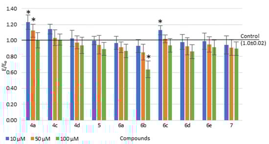 All results are presented as mean ± SEM (standard error of the mean) relative to the control (E/E0), where E is the culture with the tested substance and E0 is the negative control (without tested compounds).