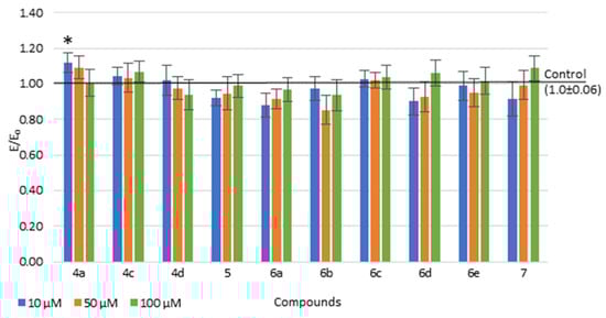 The viability of the Normal Human Dermal Fibroblasts (NHDF) cells was assessed after 24 h incubation with 10, 50 and 100 µM tested compounds in MTT assay. A concentration-dependent decrease in cell viability was observed for all compounds tested (Figure 7). After incubation with 4a, 4c and 6c compounds at 10 µM and 50 µM, a statistically significant increase in mitochondrial activity (possibly related to an increase in proliferation) was noted. In 4a and 4c, no cytotoxic effect was observed in the entire concentration range tested. The less than 30% decrease in culture viability was observed only in concentration of 100 µM for compound 6b in comparison to control (i.e., no cytotoxic potential of tested compound). Results of viability of cell cultures test showed that all new 1,2-thiazine derivatives are non-toxic for a NHDF cell line and have no cytotoxic potencies. Thus, all new compounds were directed to further research.