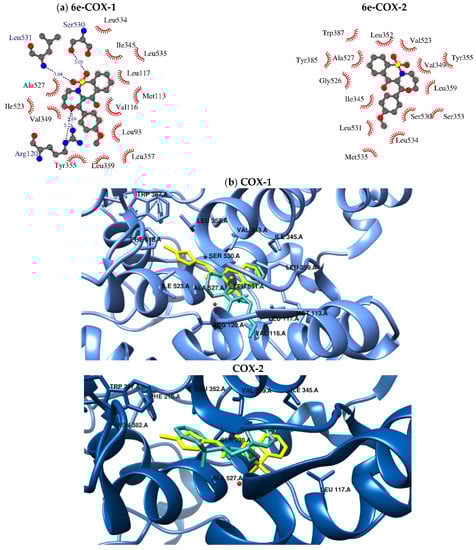 (a) The intermolecular interactions (hydrophobic as red arches and hydrogen bonds as navy blue lines). (b) Binding mode of compound 6e and meloxicam in the active center of cyclooxygenases (meloxicam is marked in yellow, 6e is green, water molecule is red).