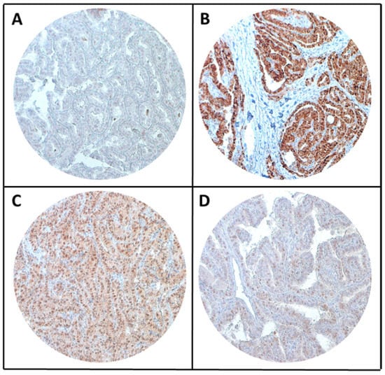 The tissue microarray (TMA) format was utilized for immunohistochemical analysis of the PTC samples. A TMA was constructed as previously described []. Briefly, a modified semiautomatic robotic precision instrument (Beecher Instruments, Woodland, WI, USA) was used to punch tissue cylinders with a diameter of 0.6 mm from representative tumor areas of donor tissue blocks and brought into recipient paraffin blocks. Two 0.6 mm cores of PTC were arrayed for each case.
