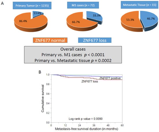 (A) Increasing proportion of ZNF677 loss in different PTC cohorts. ZNF677 loss was noted in 13.6% of primary tumors, 33.3% of M1 cases, and 46.7% of metastatic tissues. The difference in the frequency of ZNF677 loss between primary tumor and M1 cases as well as primary tumor and metastatic tissues was statistically significant (p < 0.0001 and p = 0.0002, respectively). (B) Metastasis-free survival (MFS) analysis of ZNF677 protein expression in PTC. Kaplan–Meier survival plot showing statistically significant poor MFS in cases with ZNF677 loss compared to ZNF677-positive cases (p = 0.0090).
