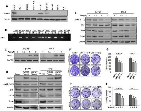 ZNF677 inhibits PTC cell growth in vitro. (A) Basal expression of ZNF677 in a panel of thyroid cancer cell lines. Proteins were isolated from nine thyroid cancer cell lines and immunoblotted with antibodies against ZNF677 and GAPDH (n = 3). (B) Methylation status of thyroid cancer cell lines assessed by methylation-specific PCR for the ZNF677 gene. MSP analyses of both methylated (M) and unmethylated (U) reactions were amplified from bisulfite-treated DNA and run in a 2% agarose gel. Distinguishable unmethylated (8505C), methylated (BCPAP, TPC-1, and K1), and partially methylated (BHT-101 and CAL62) bands can be seen in the gel. (C) Demethylation of the ZNF677 gene restored ZNF677 expression in BCPAP and TPC-1 cells. PTC cells were treated with different doses (0.5, 1, and 2 µM) of 5-aza-2′deoxycytidine for 72 h before lysis. Equal amounts of proteins were immunoblotted with antibodies against ZNF677 and GAPDH (n = 3). (D) Ectopic expression of ZNF677 downregulates AKT phosphorylation and anti-apoptotic protein expression. BCPAP and TPC-1 cells were transfected with either empty vector or with ZNF677 cDNA, and overexpressing clones were selected and immuno-blotted with antibodies against ZNF677, pAKT, AKT, Bcl-2, Bcl-xL, and GAPDH as indicated (n = 3). (E) Demethylation of ZNF677 gene downregulates AKT phosphorylation and anti-apoptotic protein expression. PTC cells were treated with the indicated doses of 5-aza-2′deoxycytidine for 72 h before lysis. Equal amounts of proteins were immunoblotted with antibodies against pAKT, AKT, Bcl2, Bcl-xL, and GAPDH (n = 3). (F,G) Forced expression of ZNF677 decreases clonogenicity. ZNF67- overexpressing clones were seeded at a density of 500 cells per well in a 6-well plate and grown for an additional 10 days, then stained with crystal violet, and colonies were counted. (H,I) Demethylation of ZNF677 gene decreases clonogenicity. PTC cells (500 cells per well in a 6-well plate) were treated with the indicated doses of 5-aza-2′deoxycytidine for 72 h and grown for an additional 10 days, then stained with crystal violet, and colonies were counted. Data presented in the bar graphs are the mean ± SD of three independent experiments (n = 3). * Indicates a statistically significant difference compared to control with p < 0.05.
