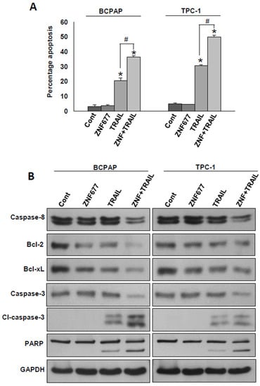 Our clinical and in vitro data suggest that ZNF677 is likely a tumor suppressor. Therefore, we wanted to determine whether ectopic expression of ZNF677 could potentiate TRAIL-induced apoptosis in PTC cells. For this, PTC cells after ZNF677 overexpression were treated with TRAIL (10 ng/mL) for 48 h and analyzed for apoptosis. As shown in Figure 4A, ZNF677 overexpression alone was not able to induce apoptosis in BCPAP and TPC-1 cell lines; however, significant apoptosis was observed after treatment with TRAIL alone of BCPAP (20.5 ± 1.8%) and TPC-1 (30.6 ± 0.67%) cell lines. Interestingly, ZNF677 overexpression followed by TRAIL treatment significantly increased the apoptotic population in BCPAP (36.6 ± 0.9%) and TPC-1 (50.09 ± 0.99%) cell lines. To confirm the above findings, we performed immunoblotting after treatment with and without TRAIL for 48 h of ZNF677- (Myc-DDK tagged) or empty vector-transfected PTC cell lines. As shown in Figure 4B, ZNF677 overexpression followed by TRAIL treatment markedly increased the cleavage of caspases-8 and -3 and PARP, as well as downregulated Bcl-2 and Bcl-xL expression in BCPAP and TPC-1 cells (Supplementary Figure S2).