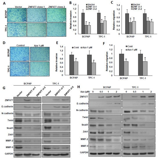 We demonstrated in our PTC patient cohort that complete loss of ZNF677 protein expression is significantly associated with aggressive clinico-pathological parameters such as extrathyroidal extension and distant metastasis. Therefore, we investigated whether ectopic expression of ZNF677 or demethylation of the ZNF677 gene using 5-aza-2′-deoxycytidine could inhibit invasion, migration, and progression of epithelial-to-mesenchymal transition (EMT) in PTC cells. Forced expression of ZNF677 significantly decreased invasion (Figure 5A,B) and migration (Figure 5C) of PTC cells. As expected, demethylation also reduced the invasive (Figure 5D,E) and migratory (Figure 5F) potential of these cells. Ectopic expression of ZNF677 markedly down-regulated the expression of N-cadherin, Twist, Snail1, Zeb1, MMP-2, and MMP-9, with an accompanying expression of E-cadherin in both PTC cell lines (Figure 5G and Supplementary Figure S3A). Similar results were observed in PTC cells after demethylation using 5-aza-2′-deoxycytidine (Figure 5H and Supplementary Figure S3B). These data demonstrate that ZNF677 attenuates the metastatic potential of PTC cells.