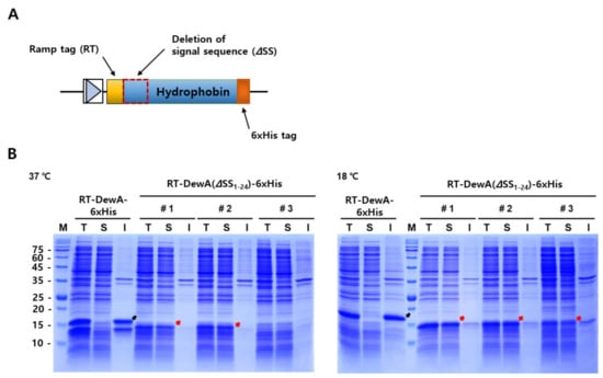 Schematic diagram of the DNA construct designed for the soluble expression of hydrophobin DewA and protein expression behavior of a recombinant hydrophobin DewA with or without the signal sequence. (A) Design scheme of the DNA construct used for the soluble expression of recombinant hydrophobin DewA. The rationally designed ramp tag was N-terminally fused, and 6× His tags were fused at the C-terminal region for Western blot analysis. The deleted signal sequence (ΔSS) of DewA is represented as a dotted box. (B) SDS-PAGE analyses (15 μg of proteins) of soluble recombinant hydrophobin expression at two different culture temperatures. Protein expressions of three independent clones (#1–3) were induced with 0.2 mM isopropyl β-D-1-thiogalactopyranoside (IPTG) at 37 °C (left panel) or at 18 °C (right panel). M, protein marker; T, total fraction; S, soluble fraction; I, insoluble fraction. Black arrows indicate insoluble expression of hydrophobin RT5-DewA-6xHis, whereas red arrows indicate soluble expression of hydrophobin RT5-DewA(ΔSS1-24)-6xHis, wherein DewA(ΔSS1-24) represents that the entire predicted signal sequence (total 24 residues) was deleted. The molecular mass of RT5-DewA-6His and RT5-DewA(ΔSS1-24)-6×His are 15.7 and 13.4 kDa, respectively.