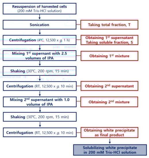 Detailed flowchart of the ATPS purification process for soluble recombinant hydrophobin DewA. This process was established by experimental modifications of known processes in the prior publications. The flowchart shows that the purification procedure uses only one reagent, that is, IPA.