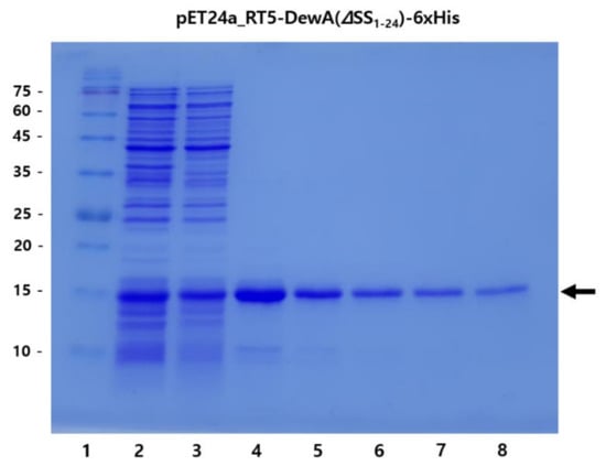 SDS-PAGE analysis of recombinant hydrophobin DewA purified by ATPS using IPA. Lane 1, protein size marker; 2, total fraction; 3, soluble fraction; 4, final white precipitate solubilized in 1 mL of 200 mM Tris-HCl buffer (pH 8.0) buffer following purification; 5–8, samples obtained by sequential dilution of previous sample (lane 4) with 1 mL of the same buffer. The arrow indicates the purified RT5-DewA(ΔSS1-24) protein.