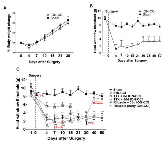 The body weight of rats for a period of 30 days were noted and percentage of body weight change compared to body weight on day 0 (day of surgery). Both ION-CCI and sham rats showed a decrease in body weight gain on day 4 following surgery, after which their body weight gain increased in a similar pattern for 30 days. There was significant increase in body weight of both ION-CCI and sham rats compared to pre-surgery body weight (F(time)2.173,30.43 = 1339, p < 0.001; two-way ANOVA), and there were no significant differences in body weight increase rate in ION-CCI rats compared to that of sham rats (F(surgery)1,14 = 1.550, p = 0.2336; Figure 1A). The mechanical threshold to orofacial stimulation in the sham-operated rats remained in the similar range as the pre-surgery baseline. In contrast, ION-CCI surgery markedly decreased the mechanical pain threshold in the ipsilateral side of the facial region, with the difference in pain threshold first being detected on the fourth day and peaking in the first week. The ION-CCI pain sensitivity was significantly higher than that of sham (F(9,120),interaction = 7.610, p < 0.001; F(6,186),time = 9.744, p < 0.05; F(1,14),surgery = 33.07, p < 0.001, two-way ANOVA repeated measures; Figure 1B) and remained as such at least for 50 days. These results are consistent with previous reports suggesting that ION-CCI surgery in rats evokes pain that is severe in the first week and causes mechanical allodynia for at least 120 days [25].