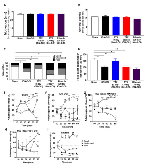 Assessment of decision-making behavior in ION-CCI rats with various pharmacological interference. (A) Motivation is measured as the duration taken to consume 100 food pellets during the last T2 training session. Motivation level is maintained at an optimum level for each rat before RGT task. All the rats were equally motivated for the task, and there was no significant difference in the motivation levels between the five groups. (B) General activity measured as the total number of nose-pokes made per minute. No significant difference was detected in the general activity between the 5 groups: sham; ION-CCI; and different pharmacological treatments, i.e., immediate TTX treated after ION-CCI, TTX treated 30 days after ION-CCI, and riluzole treated after 30 days ION-CCI. (C) The rats in each group were divided into 3 types of decision making on the basis of the choices during the last 20 min of the task. The different proportions of the three types of decision-makers in sham rats (n = 16); ION-CCI rats (n = 15); and ION-CCI rats with different pharmacological treatment, i.e., immediate TTX treated after ION-CCI (n = 17), TTX treated 30 days after ION-CCI (n = 17), and riluzole treated after 30 days ION-CCI (n = 15). Statistical significance between three types of decision-makers in sham and ION-CCI rats was determined by Kruskal–Wallis test, followed by Dunn’s test. (D) The food pellets obtained during the test for sham, ION-CCI, and treatment groups: immediate TTX treated after ION-CCI, TTX treated 30 days after ION-CCI, and riluzole treated after 30 days ION-CCI. Results are presented as mean ± SEM. Statistical significance was determined by one-way ANOVA, followed by Bonferroni’s adjusted t-test * p < 0.05. (E–I) Time course of choosing advantageous choices among good, undecided, and poor decision-makers during the RGT task observed in sham (E), ION-CCI (F), TTX-treated immediate ION-CCI (G), TTX-treated after 30-day ION-CCI (H), and riluzole administered after 30-day ION-CCI rats (I). Statistical significance was determined by one-way ANOVA, followed by one-sample t-test * p < 0.05, ** p < 0.01, *** p < 0.001 vs. 50% (chance level).