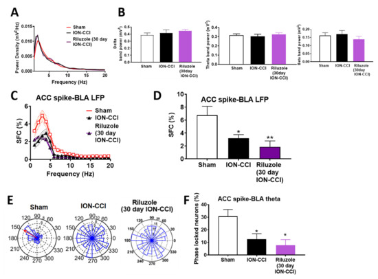 Reduction of spike-field coherence and phase-locking between ACC spikes and BLA theta in ION-CCI rats. (A) Power spectral density analysis in the frequency range from 0–20 Hz of the LFP in 30-day ION-CCI, sham-operated rats, and riluzole-treated 30-day ION-CCI rats. (B) Power spectral density showing the averaged delta band power (0.5–4 Hz), averaged theta band power (4–10 Hz), and averaged beta band power (10–20 Hz) in the ACC region in ION-CCI and sham-operated rats. (C) The SFC distribution of ACC single units as a function of frequencies in sham rats (n = 6), ION-CCI rats (n = 6), and riluzole-treated ION-CCI rats (n = 4). Shadow areas represent SEM. (D) Averaged SFC values in theta band show reduction of theta band SFC in ION-CCI rats compared to that in the sham rats. (E) Examples show polar-histograms of the ACC spike timing-BLA theta phase distribution of a single unit recorded in the ACC in one sham rat, a single unit in ACC of one ION-CCI rat, and a single unit of one riluzole-treated 30-day ION-CCI rat. The red arrow in the polar-histogram of sham rat represents angle of the mean resultant vector. (F) Averaged percentages of phase-locked neurons show a significantly decrease in ACC single-unit spikes phase-locking to BLA theta band field potential in ION-CCI rats and riluzole-treated ION-CCI rats compared to that in sham rats. Results are shown as mean ± SEM (* p < 0.05, ** p < 0.01 by one-way ANOVA followed by Bonferroni’s adjusted t test).