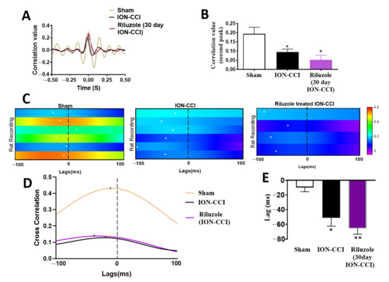 Riluzole administration in ION-CCI rats also showed a decrease in the peak of the cross-correlation coefficient compared to that of sham-operated rats (F(2,13) = 9.447, p = 0.02, one-way ANOVA; Figure 5A,B) and similar to that of untreated ION-CCI rats. All the riluzole-treated ION-CCI rats (n = 4) showed low cross-correlation between ACC and BLA (mean lag = −65.50 ± 7.848; Wilcoxon signed-rank test, n = 4 riluzole-treated ION-CCI rats, p = 0.0033 vs. sham; Figure 5C–E). These data reveal that riluzole administration does not improve the synchronization within the ACC-BLA circuitry.