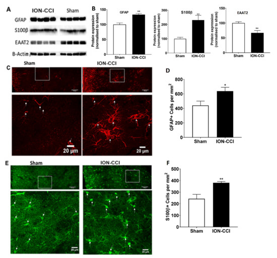 Astrogliosis in the anterior cingulate cortex (ACC) region in ION-CCI and sham-operated rats. (A) Brain tissue extracts were collected 30 days after the ION-CCI surgery or sham surgery. Immunoblot images showing GFAP, S100β, and EAAT2 protein bands from the ACC tissue lysate extracts obtained from ION-CCI and sham-operated rats. (B) GFAP and S100β protein content were increased in the ION-CCI rats, and glutamate transporter (EAAT2) was decreased in TNP rats, indicating cortical astrogliosis. (C) Representative confocal images showing increase in GFAP+ cells in the ACC. The top panel is at lower resolution showing the whole ACC region analyzed, and the bottom panel is at higher resolution showing layer IV. The white arrow marks point the cells in the ACC region. (D) The GFAP+ cells were increased by 44% in ION-CCI rats in the ACC region. (E) Representative confocal images showing increase in S100β+ cells in the ACC. The top panel is at lower resolution showing the whole ACC region analyzed, and the bottom panel is at higher resolution showing layer IV. The white arrow marks point the cells in the ACC region. (F) The S100 β+ cells were increased by 38% in ION-CCI rats in the ACC region. Statistical significance was determined by unpaired t-test, ION-CCI vs. sham, * p < 0.05, ** p < 0.01.