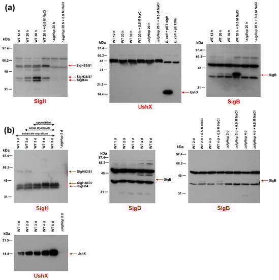 The presence of both sigma factors was similarly examined during morphological differentiation using crude extracts prepared from surface-grown cultures of S. coelicolor on solid minimal MM medium containing 0.5% mannitol to different developmental stages. Cultures were harvested at previously defined time points that correspond to different developmental stages of morphological differentiation: vegetative substrate mycelium, aerial hyphae formation, and the early and late stages of sporulation []. At the time of collection, they were examined microscopically. Consistent with previous results [], the level of the 52/51 kDa kDa form of SigH decreased during differentiation, and the levels of the shorter forms (38/37 kDa and 34 kDa) increased, reaching their highest levels at day 5, corresponding to sporulation of aerial hyphae. All signals were correctly absent in the S. coelicolor ΔsigHop operon mutant (Figure 1b). In contrast to the results from cultures grown in liquid NMP medium, where UshX was absent, the level of UshX increased continuously during differentiation. The signal corresponding to the theoretical mass of UshX (14,273) was missing in the S. coelicolor ΔsigHop operon mutant.