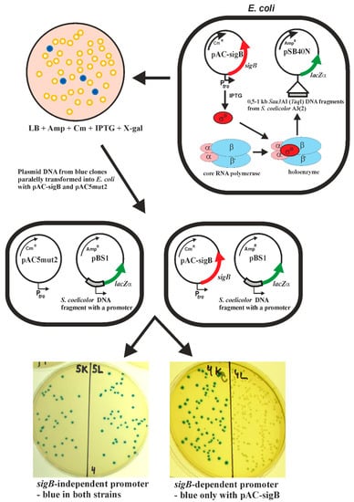 We have previously developed a heterologous system to identify promoters directly recognized by sigma factors []. The method is based on two compatible plasmids in E. coli. One plasmid carries the sigma factor gene under the control of the inducible trc promoter, and the other plasmid contains a library of Streptomyces chromosomal fragments upstream of the lacZα reporter gene. Under inducing conditions, the heterologously produced sigma factor can associate with E. coli core RNA polymerase, and the resulting RNA polymerase holoenzyme is able to recognize its cognate promoter in the library of DNA fragments and activate the lacZα reporter gene. Such colonies were blue on 5-bromo-4-chloro-3-indolyl-β-D-galactopyranosid (X-gal) selective plates. To distinguish between promoters constitutively active in E. coli and sigma factor-dependent promoters, plasmids isolated from such blue colonies were subsequently transformed into two E. coli strains; one strain with the expression plasmid alone (pAC5mut2), and the other with the expression plasmid containing the particular sigma factor gene. The sigma factor-dependent promoter is active only in E. coli with the expression plasmid containing the sigma factor gene. This strategy is illustrated for the S. coelicolor sigB gene in Figure 2. This heterologous two-plasmid system has been successfully used to identify promoters recognized by the sigma factors SigF, SigG and SigH from S. coelicolor A3(2) [,,,,], SigB from Staphylococcus aureus [], and SigF from Mycobacterium tuberculosis [].