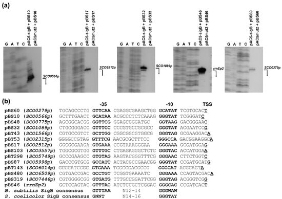 In the present study, we used this method to identify promoters recognized by SigB from S. coelicolor A3(2), as shown in Figure 2. Two S. coelicolor M145 libraries with small DNA fragments (0.5–1 kb TaqI cloned into the ClaI site of pSB40N and Sau3AI cloned into the BamHI site of pSB40N) were used to transform E. coli containing pAC-sigB. Screening of about 150,000 colonies from each library under inducing conditions on LBACIX plates revealed 29 SigB-dependent clones in the TaqI library (pBT) among the 710 blue colonies analyzed, and 18 in the Sau3AI library (pBS) among 577 blue colonies analyzed. Nucleotide sequence analysis of all plasmids isolated from positive clones revealed 14 different plasmids (Figure 3). Most of them were present in both libraries. To identify the transcription start site (TSS) of the SigB-dependent promoters, high-resolution S1-nuclease mapping was performed using RNA isolated from E. coli containing each positive plasmid and pAC-sigB grown under inducing conditions. E. coli containing each positive plasmid and the expression vector pAC5mut2 alone was used as a negative control. An RNA-protected fragment was identified for each plasmid present only in E. coli with pAC-sigB (Figure 3a), corresponding to the TSS for each promoter (Figure 3b). The promoter sequences were similar to the consensus sequence of homologous sigma factor SigB from B. subtilis [] and the previously proposed consensus sequence of SigB-dependent promoters in S. coelicolor A3(2) [].