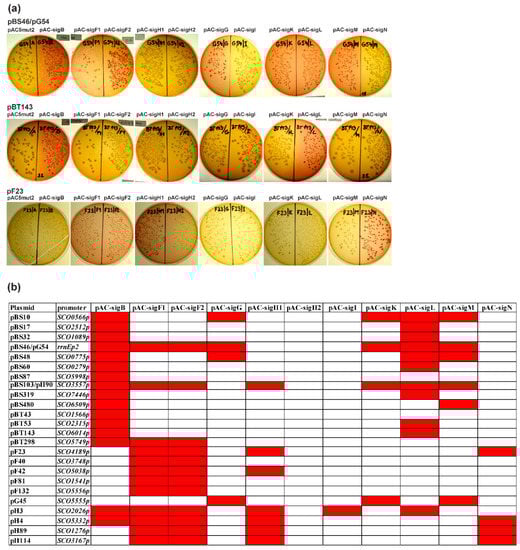 The genes for all nine sigma factors were PCR-amplified from annotated N-terminal methionine and cloned into pAC5mut2 under the control of the trc promoter, resulting in pAC-sigB, pAC-sigG, pAC-sigI, pAC-sigK, pAC-sigL, pAC-sigM, pAC-sigN. Sigma factor SigF contains an unusual short repeat N-terminal region []. Therefore, in addition to the previously published pAC-sigF1 [], we prepared a new plasmid pAC-sigF2 containing N-terminally truncated SigF (from MSRGADTR…), which lacked this repeat region. Sigma factor SigH contains an unusually long N-terminal region compared to all other SigB homologues []. Therefore, in addition to the previously published pAC-sigH1 [], we prepared a new plasmid pAC-sigH2 containing the entire annotated SigH, including this N-terminal region. Subsequently, each plasmid containing a sigma factor-dependent promoter was transformed into E. coli containing an expression pAC plasmid with a particular sigma factor gene. In contrast to screening conditions to identify the SigB-dependent promoters, we used cheaper MacConkey agar plates, which gave similar results as LB plates with X-gal (Figure 5a). The final results revealed cross-recognition of most promoters by more than one SigB homologue (Figure 5b).
