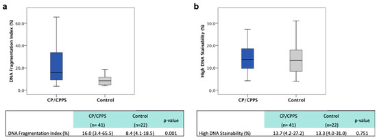 The DNA fragmentation index (DFI) was used to analyze the extent of DNA fragmentation in every sample. Overall, CP/CPPS patients showed significantly increased DFI levels with a median of 16.0% (range 3.4–65.5), compared to the median of the control group (8.4%, range 4.1–18.5) (p < 0.01, Figure 1). Both groups exhibited a heterogeneous distribution of the DFI with both very high and very low levels (examples are shown in Figure A1). With regard to reference values, as discussed in the current literature, 36.6% of CP/CPPS patients exhibited a DFI of >25%, while 29.3% of the patients’ samples showed a DFI >30%. None of the control probands exhibited DFI >25%.