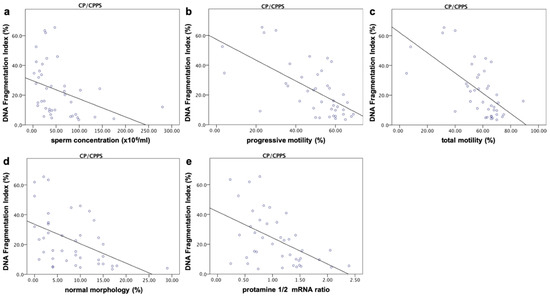 Correlations between DFI and sperm parameters. The DFI showed significant negative correlations with total sperm number (r = −0.320, p ≤ 0.05, not shown), sperm concentration (r = −0.508) (a), progressive (r = −0.636) and total motility (r = −0.625) (b,c), normal morphology (r = −0.511) (d) as well as the protamine 1/2 mRNA ratio ((r = −0.494) (e); for all parameters p ≤ 0.001). The DFI was significantly positively associated with sperm head (r = 0.345, p ≤ 0.05, not shown) and tail defects (r = 0.621, p ≤ 0.001, not shown).