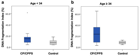 In order to reduce the effect of age on sperm DNA fragmentation, we build age-matched groups. We detected significantly elevated DFI levels in patients when comparing patients and healthy volunteers <34 years (15.3% vs. 8.3%, p < 0.05). The older group (≥34 years) showed a clear, though not statistically significant, tendency of increased DNA fragmentation in the CP/CPPS group (23.8% vs. 8.5%, p = 0.094) (Figure 3).