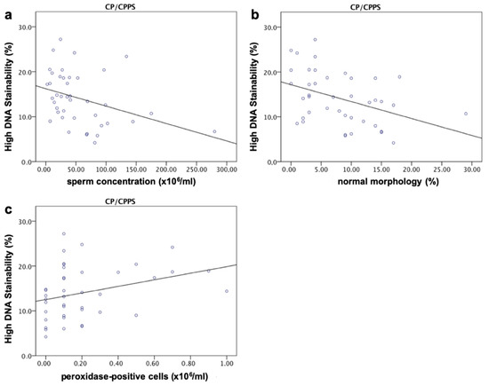 As studies have revealed an influence of several diseases of the male urogenital tract on male fertility, the role of CP/CPPS remains a matter of discussion. It has been shown that CP/CPPS is associated with unfavorable effects on semen parameters evaluated by WHO standard semen analysis [9,10]. Recently, when evaluating male fertility, increasing focus has been attributed to additional aspects and parameters besides the WHO standard sperm analysis. One of these parameters is sperm DNA fragmentation, being defined as single and double-strand breaks within sperm DNA. It has a variety of etiologies, which each presumably contributes to multifactorial DNA damage rather than a single responsible factor [11]. Possible pathomechanisms include intrinsic and extrinsic causes, such as abnormal spermatid maturation, abortive apoptosis and oxidative stress caused by reactive oxygen species (ROS) [12]. Moreover, pathologies of the male reproductive system, systemic diseases, iatrogenic and environmental factors are also contributing to these molecular mechanisms [13,14].