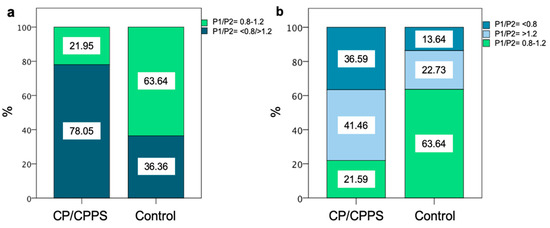 The majority of CP/CPPS patients in our study exhibited P1/P2 mRNA ratios >1.2 and <0.8, meaning an imbalance of these proteins and possibly defective protamination. While the median was within this range in both groups, there was no change towards a specific direction. Aberrant protamine ratios have been associated with male infertility, reduced pregnancy rates, impaired embryo quality and the protamine ratio has also been shown to serve as a marker estimating the fertilizing potential of men in ART programs [24,25,26,53]. While the P1/P2 mRNA ratio in CP/CPPS has not been evaluated to date, previous studies found significant changes in the parameter in other urogenital conditions, such as significant elevations in patients with varicocele or increased rates of aberrant ratios in patients with bacterial infection [43,54]. Our results, for the first time, demonstrate possible changes of this parameter in CP/CPPS and yield a possible negative impact on patients’ fertility.