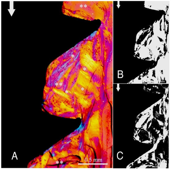 As for Figure 1, for group E (see Table 1). Mag. 100×. (A) White arrows: main direction of occlusal load; *: Havers canals; **: marrow space. The bone collagen fibre orientation is transverse (white-blue) and longitudinal (yellow-orange). (B,C) Computer separation of transverse (B) and longitudinal (C) bone collagen fibre orientations.