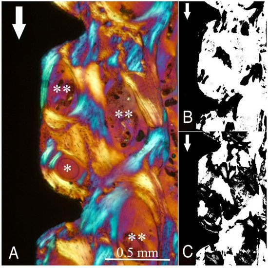 As for Figure 1, for group F (see Table 1). Mag. 100×. (A) White arrows: main direction of occlusal load; *: Havers canals; **: marrow space. The bone collagen fibre orientation is transverse (white-blue), and longitudinal (yellow-orange). (B,C) Computer separation of transverse (B) and longitudinal (C) bone collagen fibre orientations.