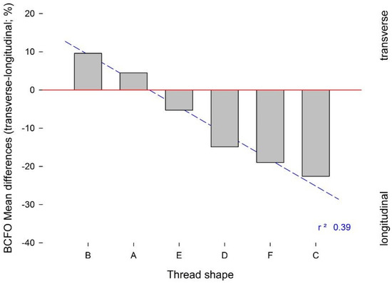 The statistical analysis was carried out using Sigma Stat 3.5 statistical package (SPSS Inc., Ekrath, Germany). The differences were evaluated using parametric tests, as the data were normally distributed. Statistical evaluation was carried out using one-way ANOVA to test for overall significance, followed by Holm–Sidak tests for multiple comparisons among the groups to identify individually significant data. Linear regression analysis was conducted to investigate the correlation between the amount of transverse and longitudinal BCFO and thread shape. A p value < 0.05 was considered the threshold to detect statistically significant differences.