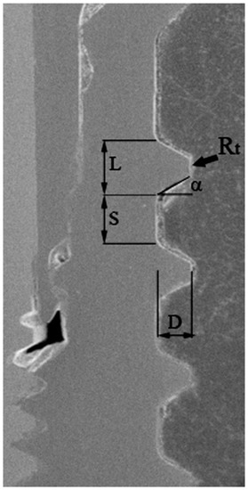 SEM image for definition of the titanium dental implant thread design, according to the thread width (L), thread depth (D), top radius of thread curvature (Rt), flank angle (α), and inter-thread straight section (S). Implant on the left, bone on the right. Mag. 50×.