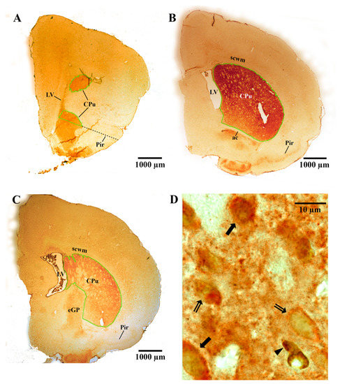 - Ouimet, C.C.; Langley-Gullion, K.C.; Greengard, P. Quantitative immunocytochemistry of DARPP-32-expressing neurons in the rat caudatoputamen. Brain Res. 1998, 808, 8–12. [Google Scholar] [CrossRef]